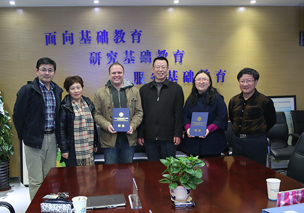 曹卓良代表学校为力·迪斯尼博士与耿华博士颁发了基础教育改革与发展协同创新中心“特约研究员”聘书。